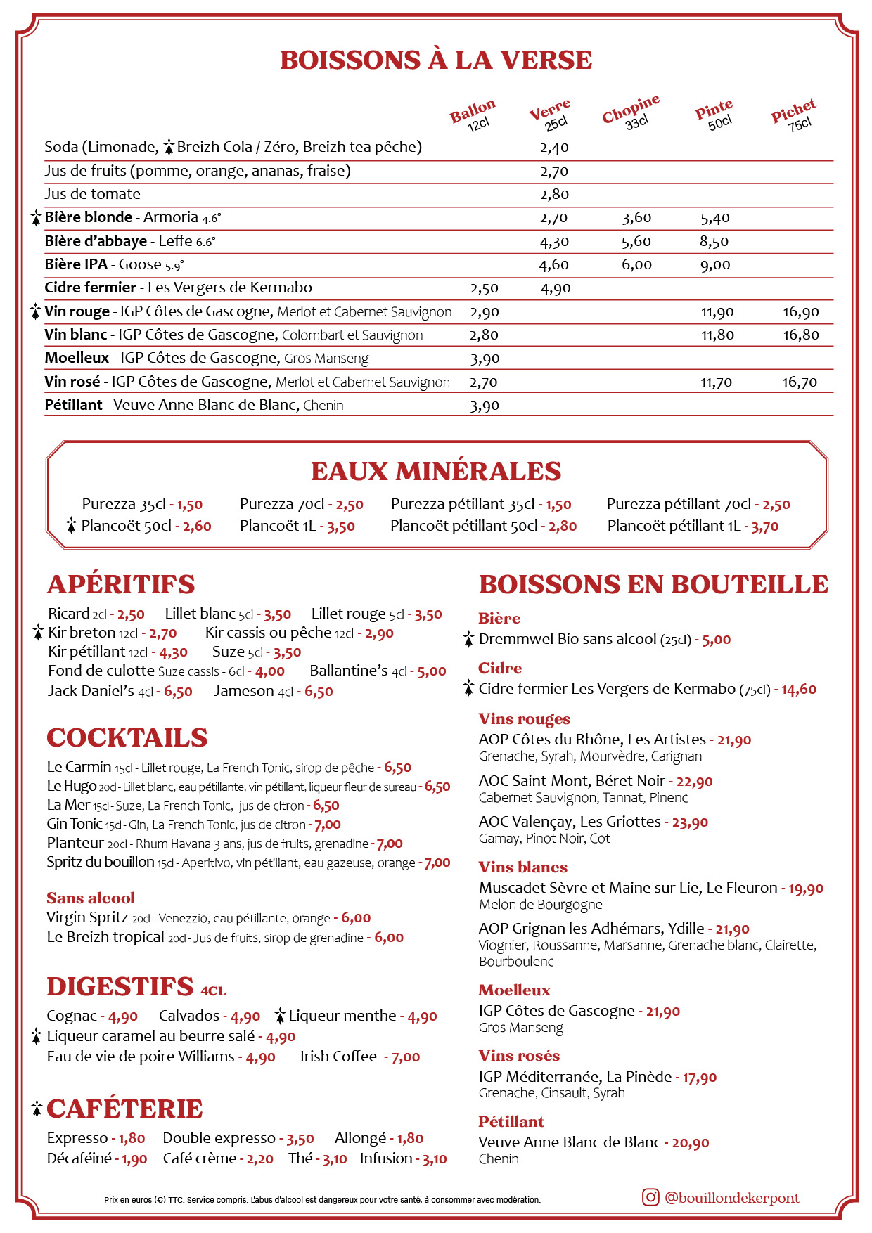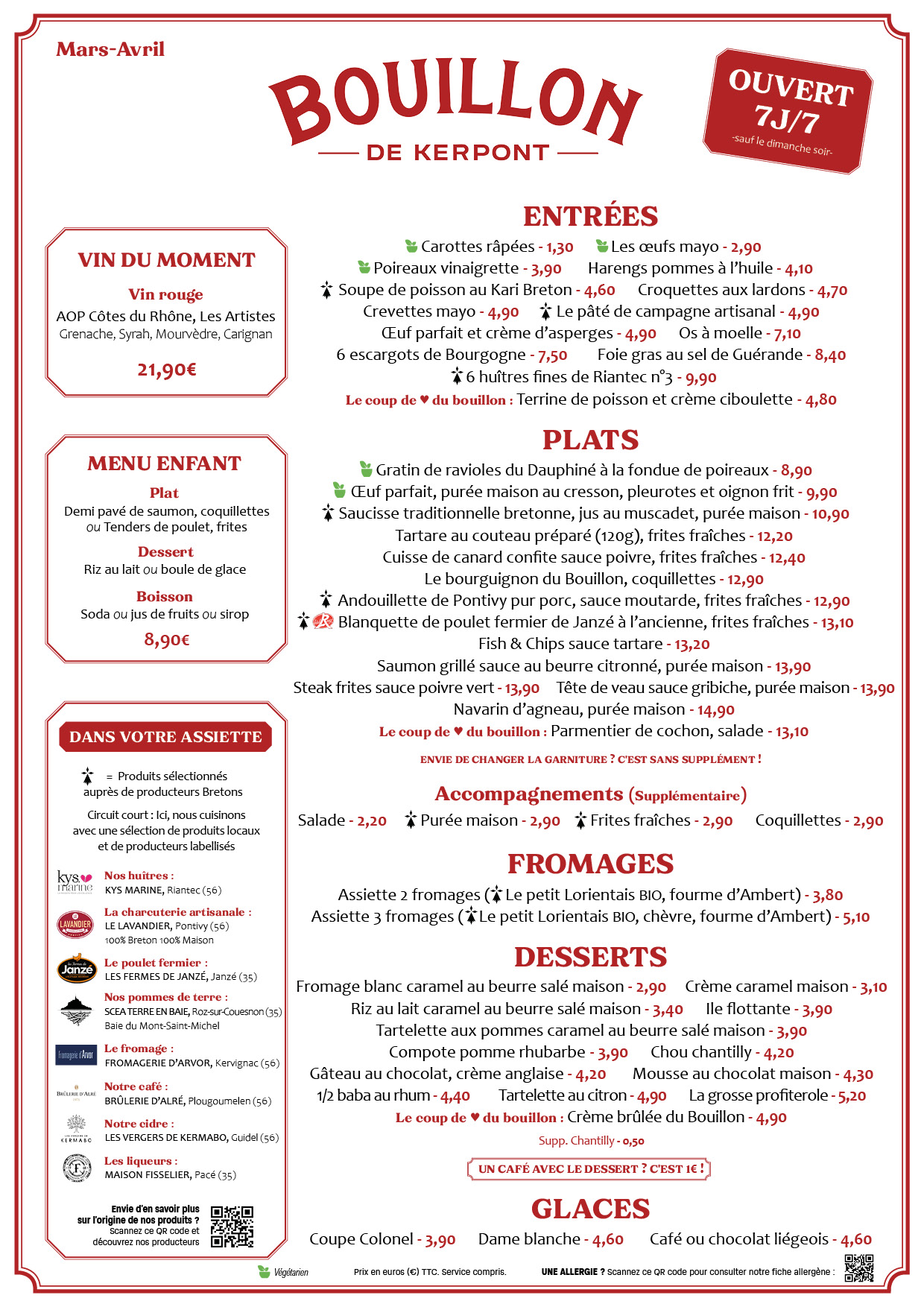 Au Bouillon de Kerpont, nous faisons vivre l’esprit des célèbres bouillons parisiens à travers une cuisine simple, généreuse et faite maison. Nos plats, préparés à partir d'une sélection de produits locaux et de producteurs bretons labellisés, sont proposés à partir de 8,90€.